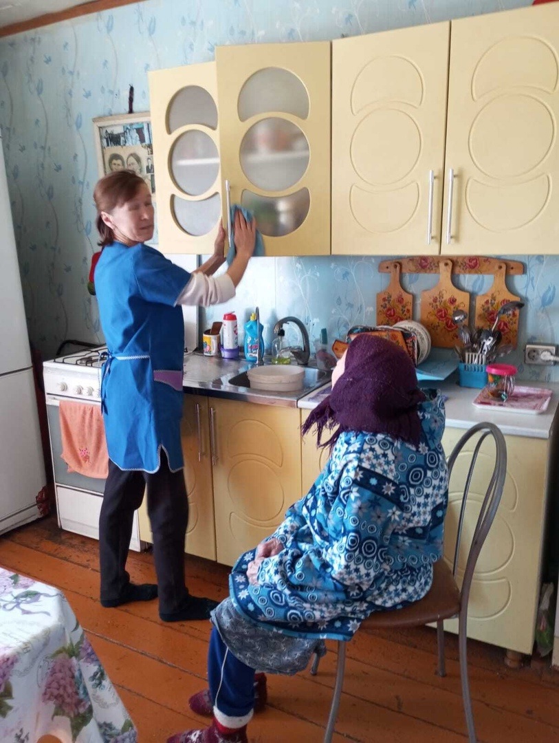 Социальные работники провели генеральную уборку: вымыли потолки, окна, шкафы и посуду, выстирали и повесели занавески, провели влажную уборку дома.